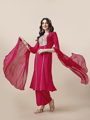 EthnicJunction Women’s Cotton Silk Embroidered Kurta Palazzo and Dupatta Set Pink
