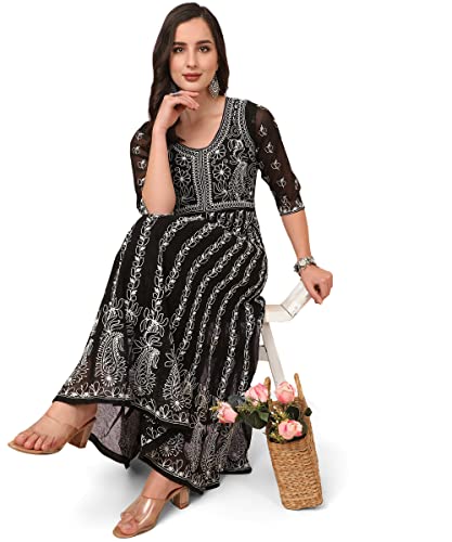 EthnicJunction Women’s Georgette Chikankari Embroidered Anarkali Kurta Black