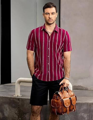 This beach shirt for men is short sleeves, traditional collar, and full button-down front closure for a timeless casual style.