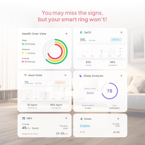 REAL TIME HEALTH INSIGHTS – Continuously tracks vital signs including heart rate, HRV, SpO2, body temperature, and stress levels.