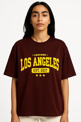 LEOTUDE Women’s Cottonblend Half Sleeve Round Neck Oversized Fit Tshirt (Fs49_Brwn_Losangl_P_Brown_S, Shirt)