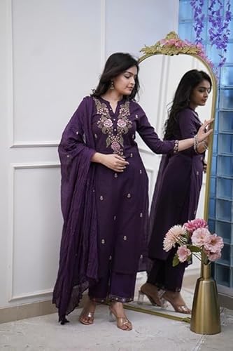 ✅ Elegant Embroidered Kurta Set for Women – Perfect for Festive & Party Wear: This stunning wine-colored kurta set includes a beautifully embroidered straight kurta, matching pants, and a flowy chinon dupatta, ideal for Durga Puja, weddings, and ethnic celebrations.