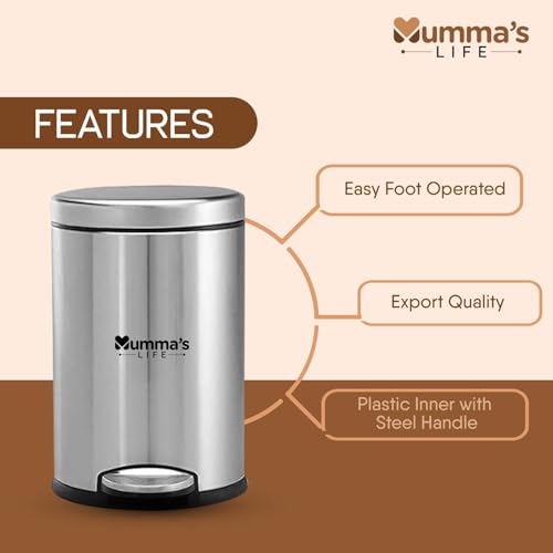 Mumma’s LIFE 5L Steel Dustbin for Home – Stainless Steel Silver Pedal Bin with Plastic Inner Bucket & Lid | Round Garbage Bin, Trash Can, Dustbin for Bathroom with Lid, Kitchen, Office – 7×11 inch