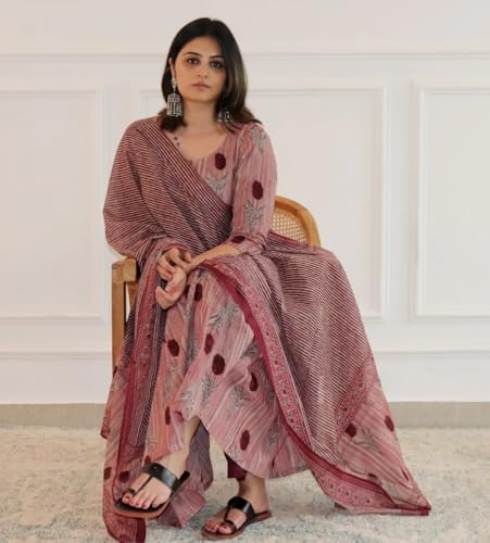 Nermosa Women Printed Anarkali Kurta and Pant Set with Dupatta (in, Alpha, L, Peach)