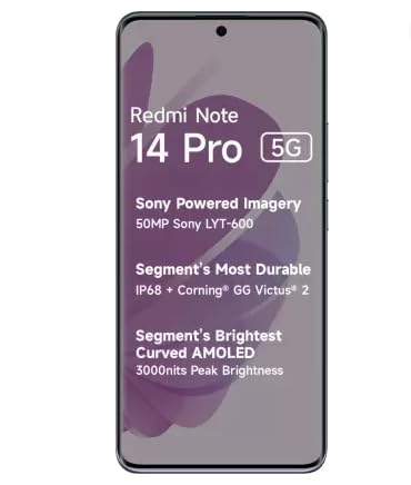 Redmi Note 14 Pro 5G Phantom Purple 8GB RAM 256GB Storage|50 MP Sony Camera Setup|Corning Gorilla Glass Victus 2 | 1.5K 3D Curved AMOLED | Mediatek Dimensity 7300- Ultra