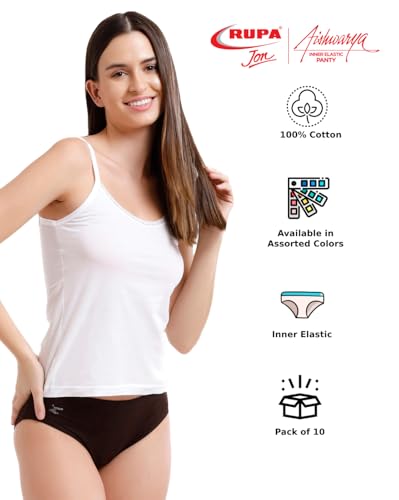 Rupa Jon Women Cotton Solid Mid Waist Hipster with Ultrasoft Concealed Waistband, Full Coverage Panty, Pack of 10, Assorted, Medium