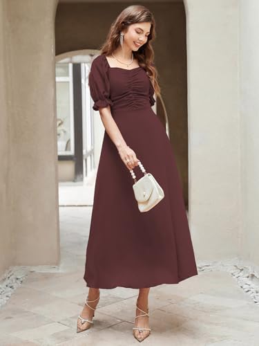 Shasmi Girl’s & Women’s Solid Brown A-Line Ruched Puff Sleeve Maxi Long Evening One Piece Long Dress for Women Stylish (Dress 131 Brown-XL)