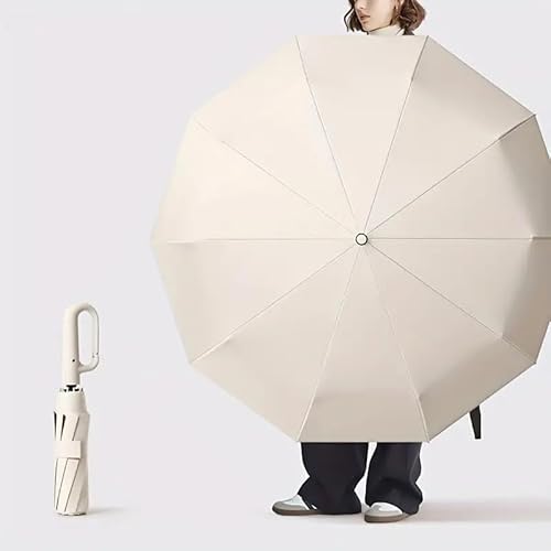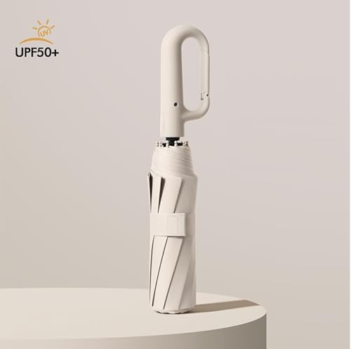 STAR WORK Umbrella with Carabiner Handle, Wind Proof Umbrellas For Rain, 46 Inch Portable Reverse Folding Umbrella, Car Umbrella for Women Men, 10 Ribs (CREAM)