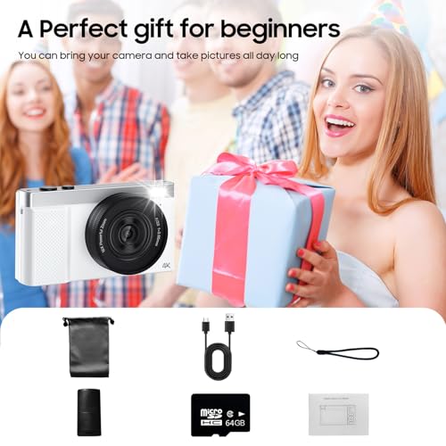 TZZPL 4K Digital Camera, 64MP Vlogging Camera for Photography with 3″ 180° Flip Screen, 16X Digital Zoom Point and Shoot Camara with 64GB Micro SD Card for Beginner (White)