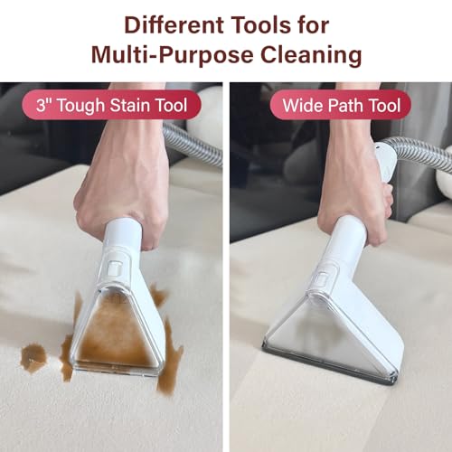 【3 Tools for All Your Cleaning】 : The carpet cleaner machine comes with 2 types of cleaning tools: Wide path tool for quickly tackling large stains. Tough stain tool for carpets, couches, upholstery, stairs, car interiors even pet beds. The carpet cleaner machine also features a self-cleaning function that can clean the dirty water inside the pipes.