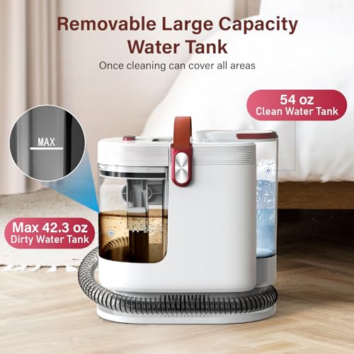 【Dual Water Tank】: Portable upholstery cleaner machine features a dual-tank system with a 54oz clean water tank and a 42oz dirty water tank, allowing you to easily detach the tanks for filling, draining, and cleaning. Tips: Do not exceed the MAX line in the dirty water tank, as it may cause the carpet cleaning machine’s suction to stop.